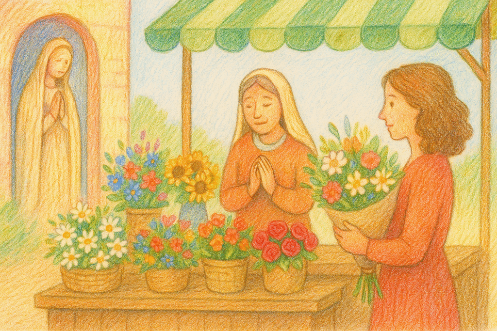 Se dice que en una ciudad, cerca de un santuario dedicado a Nuestra Señora, había una floristería muy famosa por la variedad de flores que ofrecía. Las personas que visitaban el santuario solían pasar por esta tienda para comprar flores, especialmente porque se decía que vendía las flores que le gustaban a Nuestra Señora. La mujer que regentaba el puesto era una cristiana devota y siempre trataba de compartir su fe con quienes venían a comprar flores. Se esforzaba por decir algo amable y edificante, adaptado a lo que podía percibir u observar en la persona, inspirando optimismo en algunos, alegría en otros, etc.