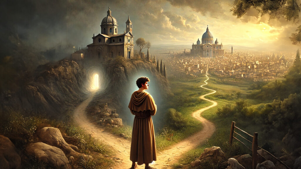 St. Benedict’s father sent him to Rome to study science and literature. However, soon after arriving in the city, St. Benedict became aware of the decadent life of the citizens of Rome. He immediately began to discern the situation and decided to flee Rome and go to a place where he could save his faith. His reason for this decision was that he preferred to live ignorant but in accordance with his faith, rather than being learned and living a vicious life.